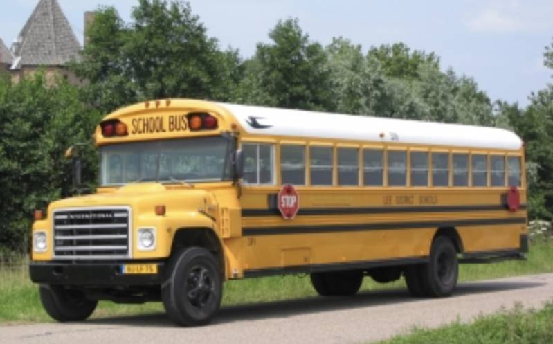 Met zo'n échte Amerikaanse schoolbus op weg naar de IJsselhallen.
